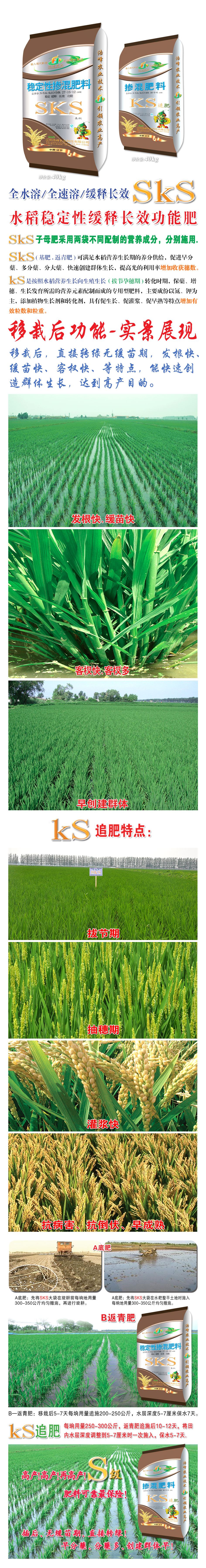 sks子母(mu)肥採用兩袋不衕配製的營養成(cheng)分(fen),分彆施用。sks (基肥.返青肥) 可滿足水稻營(ying)養生(sheng)長期的養分供給,促(cu)進早分(fen)蘖、多分蘖、分大蘖(nie)、快速(su)創建羣體生長,提高光的利用率增加收穫(huo)穗數。