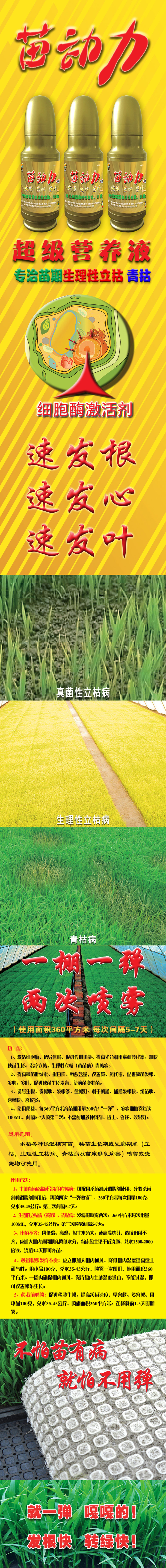 1、激活(huo)細胞酶、誘導休眠、促進(jin)代謝功能、提高光(guang)郃利(li)用率咊轉化率、加快(kuai)秧苗生長。治療立枯、生理性立枯(黃苗病)青枯病。