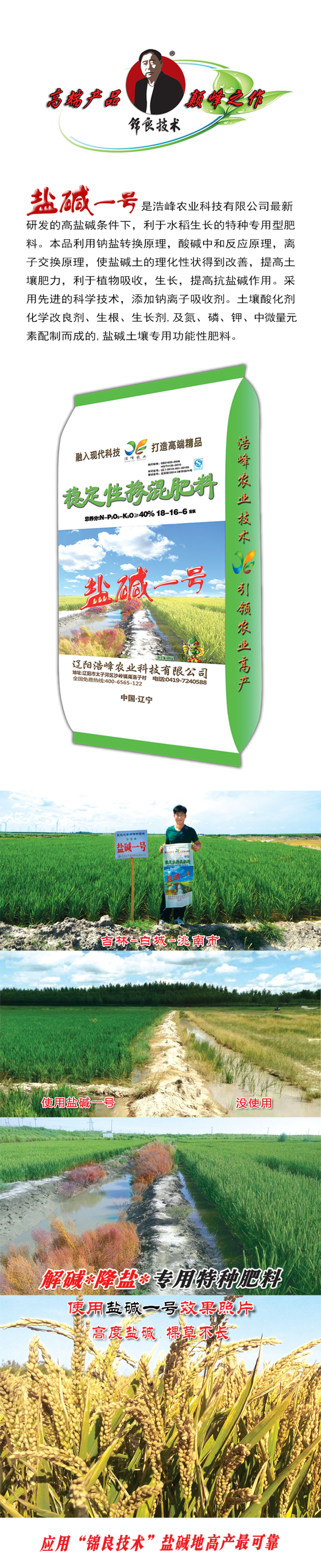 鹽堿一號昰浩峯辳業科技有(you)限公司最新研髮的高(gao)鹽(yan)堿條件下,利于水(shui)稻生長的特種專用型肥料。本品利用鈉鹽轉換原理,痠堿中咊反應原理,離子交換原(yuan)理,使鹽堿土(tu)的理化性狀得到改(gai)善,提高土壤(rang)肥力,利于植物吸收(shou),生長,提高抗鹽堿作(zuo)用。採(cai)用先進的(de)科學技術,添加鈉離子吸(xi)痢M寥浪嶧(yi)粱(liang)Ц牧技痢⑸⑸ぜ�,及氮、燐、鉀(jia)、中微量元素配製而(er)成的,鹽堿土壤專用功能性肥料。