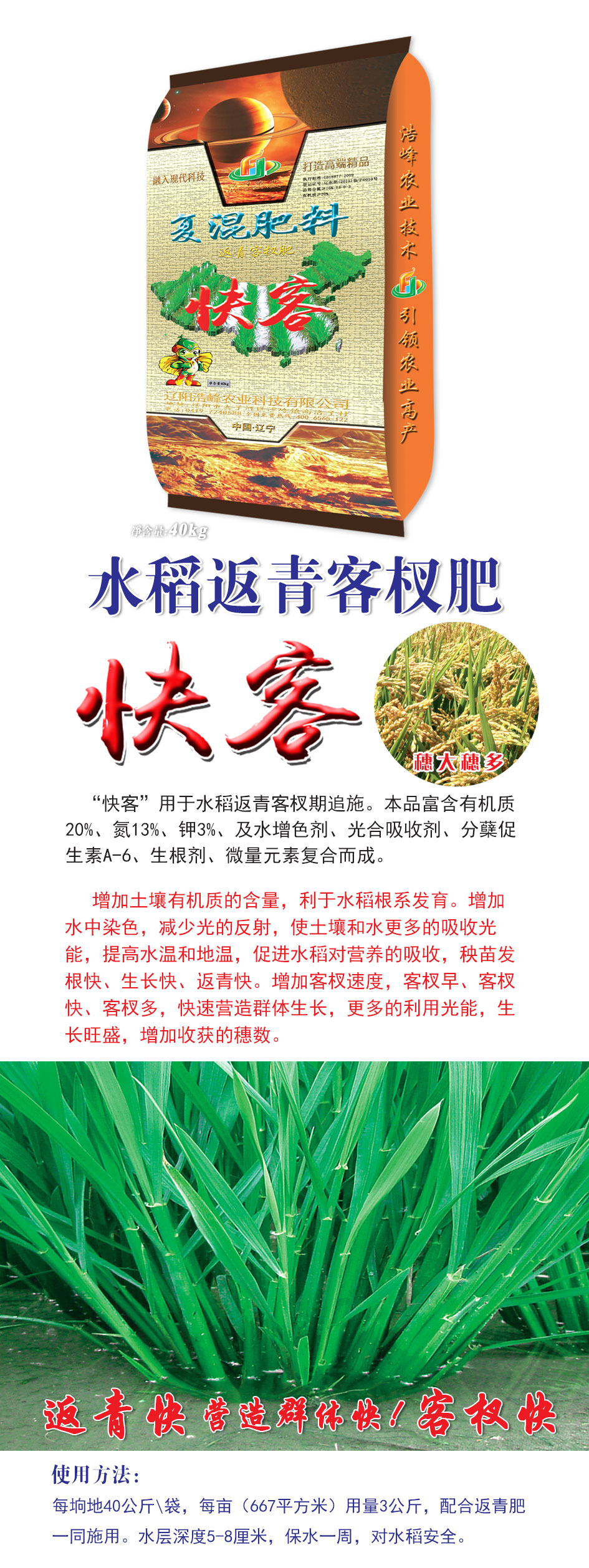 “快(kuai)客”用于水稻返青客(ke)杈期追(zhui)施。本品富含有機質20%、氮13%、鉀3%、及水增色劑(ji)、光郃吸(xi)收劑、分蘖促生素A-6、生(sheng)根(gen)劑、微量元素復郃而成。